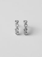 A pair of refined row earrings set with heart shaped, clear stones arranged in a soft vertical line.