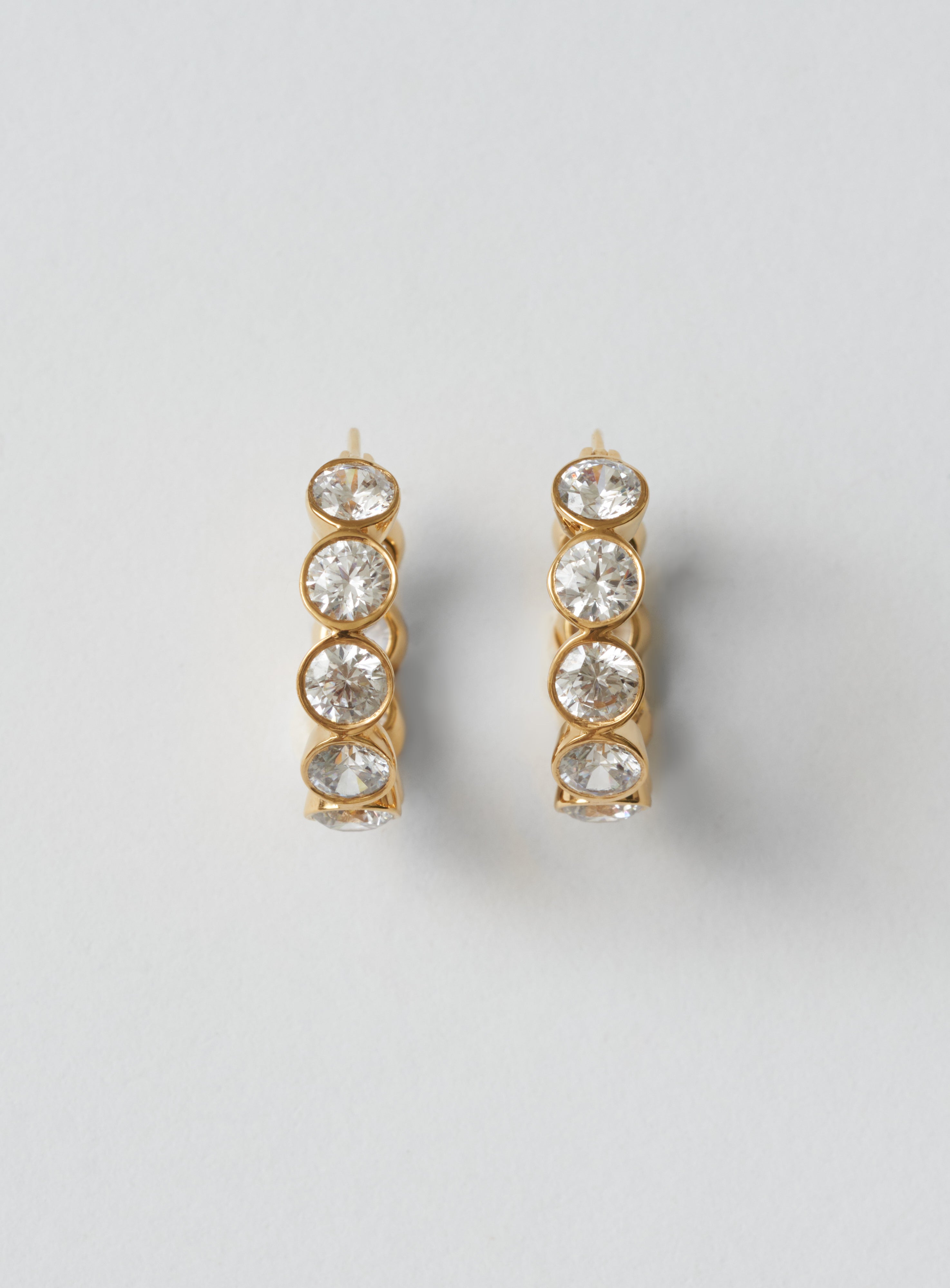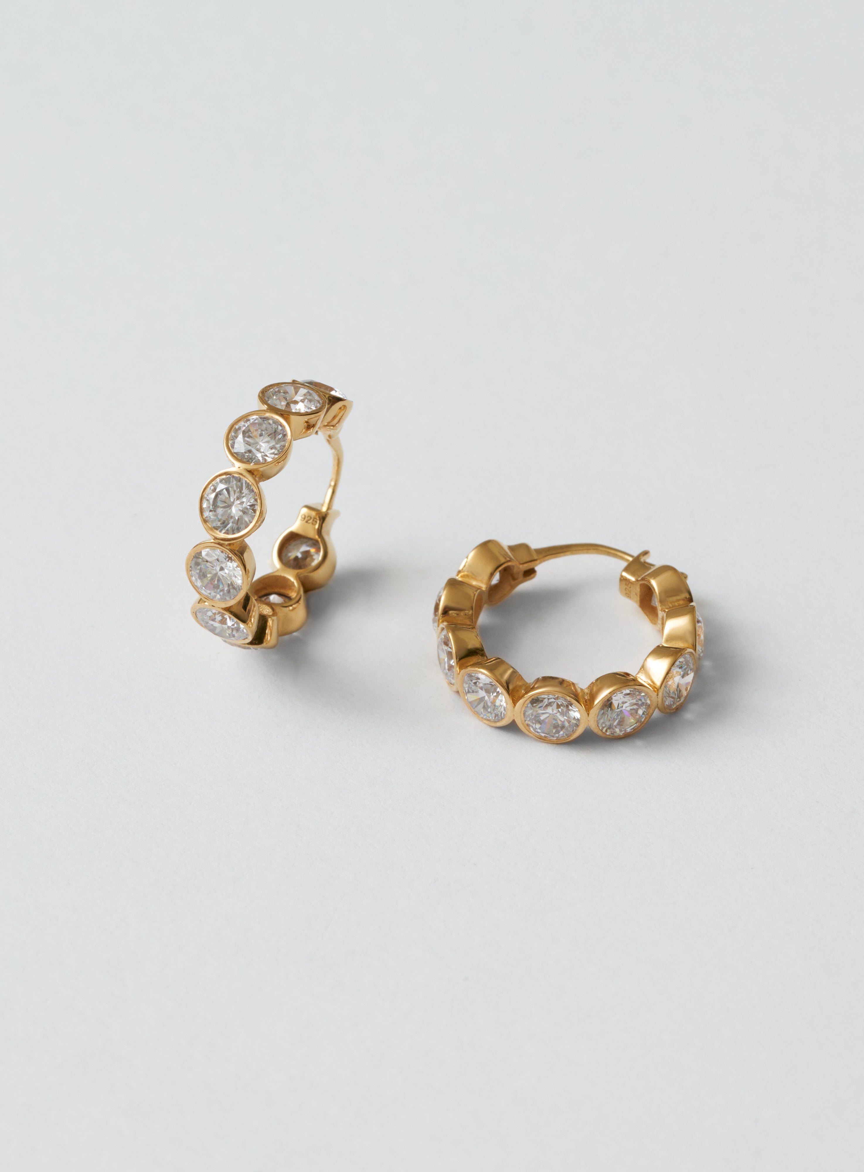 A pair of refined hoop earrings set with clear, precision cut stones all the way around.